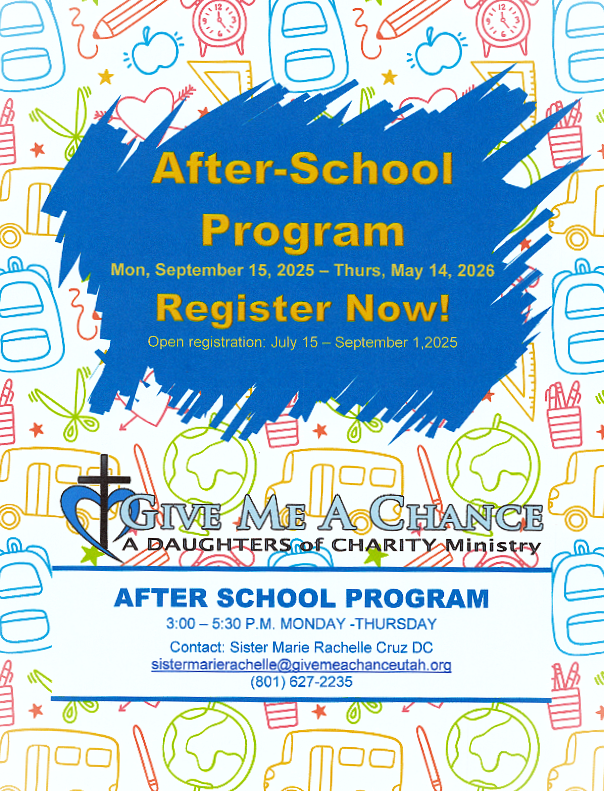 Come in to the Give Me A Chance learning center to apply. For any questions, please contact Sister Marie Rachelle Cruz, DC at (801) 627-2235, or at sistermarierachelle@givemeachanceutah.org. Spots are limited!